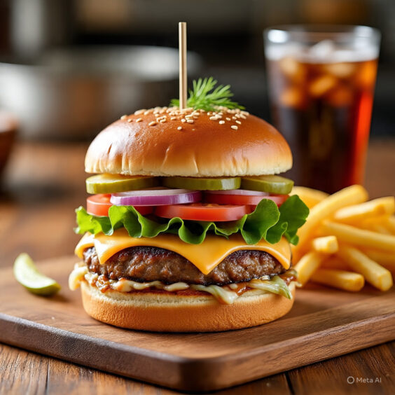 Tender beef patty smashed on the grill for extra juiciness and crispy edges, topped with fresh lettuce, tomatoes, pickles, and our signature sauce on a soft bun.